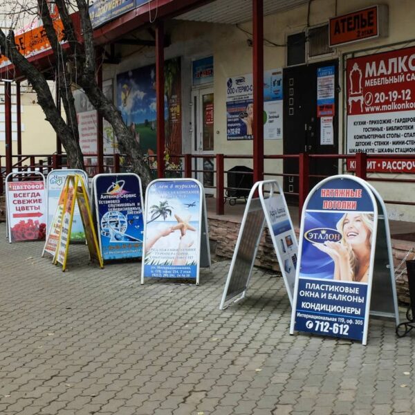 Штендеры — это мобильные, недорогие и простые в эксплуатации средства наружной рекламы. Они используются в качестве инструмента привлечения и информирования клиентов на улицах, вблизи мест продаж рекламируемых товаров и услуг, в торговых залах, офисах, при выездной торговле, на ярмарках, выставках и т.д. Особенно необходимы переносные штендеры тем компаниям, вывески которых не видны клиенту с первого взгляда.